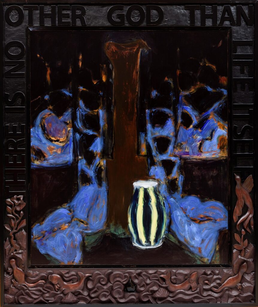Hans van Hoek laat dikwijls taal en beeld samengaan. De woorden cirkelen rond begrippen als omarming, liefde, eenheid, waarheid, vrede en menselijkheid. Dit zou je het wereldbeeld van de kunstenaar kunnen noemen. Daarnaast gebruikt hij woorden die naar beeldmotieven wijzen: baders, waterval, rotsen, kimono, vaas, donker licht, zwart water en verborgen wit. Het is een geheimzinnig universum waarmee we kennis maken in dit werk.